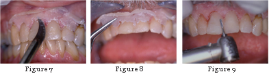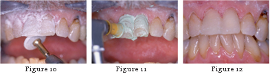 4.Place Turbo Temp 2 (an auto-cure composite temporary material), and have the patient bite into centric for 2.5 minutes. Trim at the margins with a 12a blade, cutting away the excess (figures 6 and 7). The flash is easily removed once it has been trimmed (figure 8). 5.Shaping with a high speed can quickly refine the final shape (figure 9)